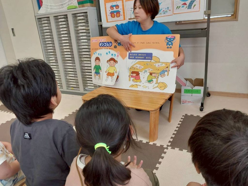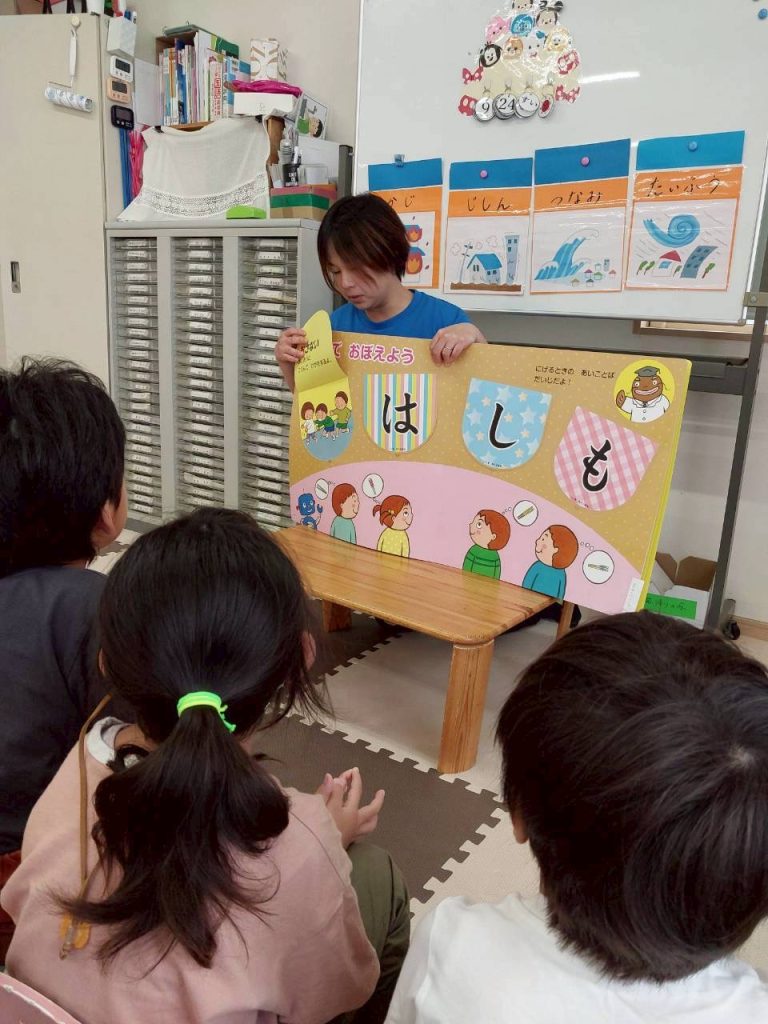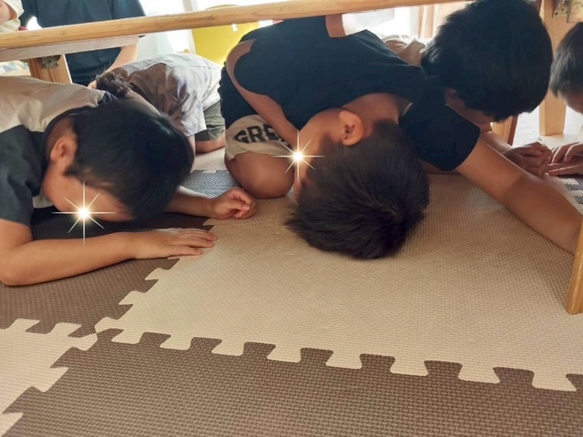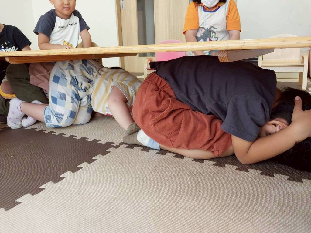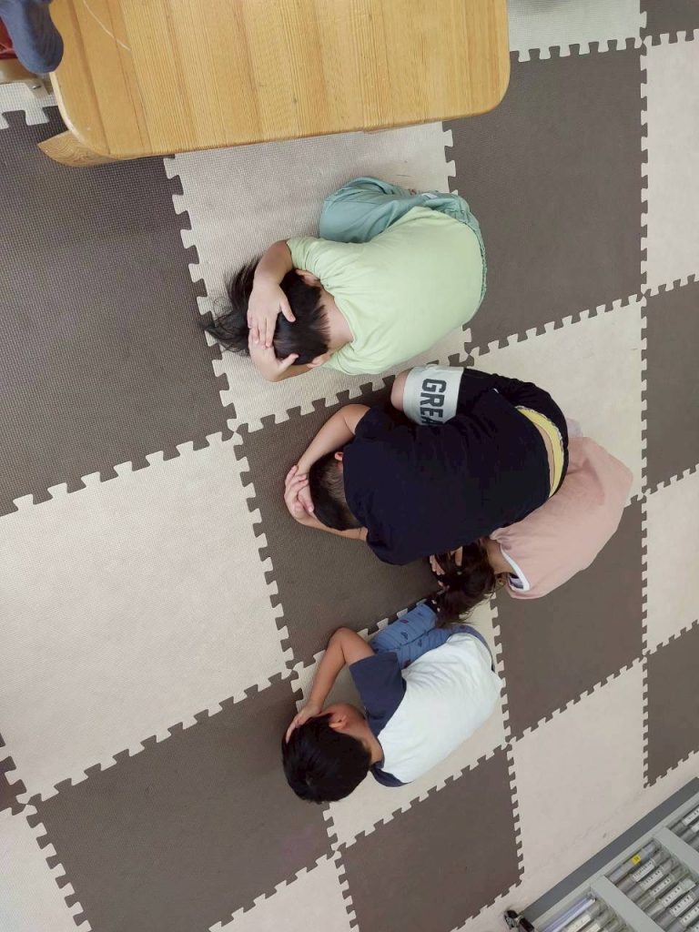 地震が起きた時の逃げ方、隠れ方など絵本で楽しく学びました!